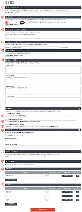 ここでは、ホームページ全体に関する基本的な事項を設定します。