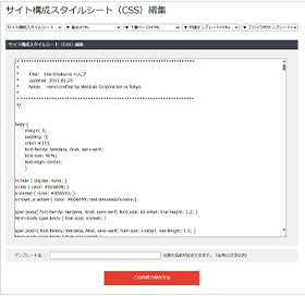 管理者画面左メニューにある「設定・メンテナンス」メニューから「オリジナルデザインテンプレート設定」ボタンをクリックしてください。HTMLとCSSの編集画面が表示されます。 |