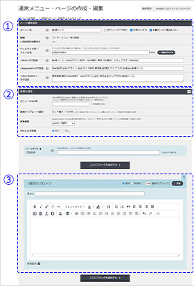 新規に作成するページのメニュー名、設置階層、URL(アドレス)検索エンジン対策のキーワード設定を行います。