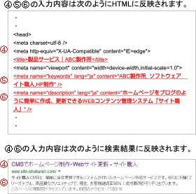 ④「<title>タグ設定」 ブラウザのタイトルバーや検索エンジンの一行目に表示されます。 (入力例)製品サービス情報|ABC製作所