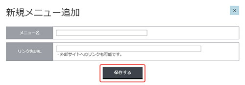 「メニュー名」「リンク先URL」を入力し、「保存する」ボタンをクリックしてください。リンク先URLは外部サイトの指定も可能です。