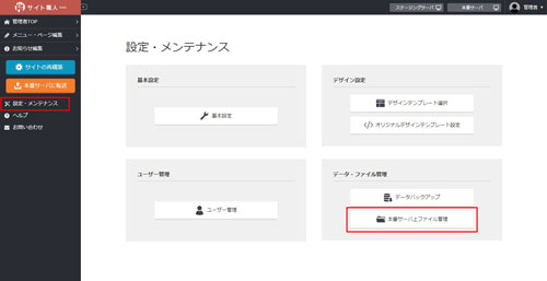 ②設定・メンテナンス メニューから「本番サーバ上ファイル管理」ボタンをクリックしてください。