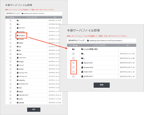 ※この機能を使えば、サイト職人以外で作られたファイルを削除することも可能ですが、それらのファイルを削除した場合、サイト職人の操作(再転送)では元に戻すことが出来ませんので、ファイルを削除する際には本当に不要なファイルか、必ずご確認ください