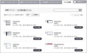 ポップアップウィンドウで、右のような「ファイルアップロード画面」が表示され、アップロードした画像の一覧の確認や削除、ページへの反映を行うことができます。