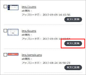 画像一覧から、反映させたい画像の右下にある「本文に反映」ボタンをクリックすると、その画像が選択された状態でアップロード画面に進み、ページに画像をアップロードすることができます。